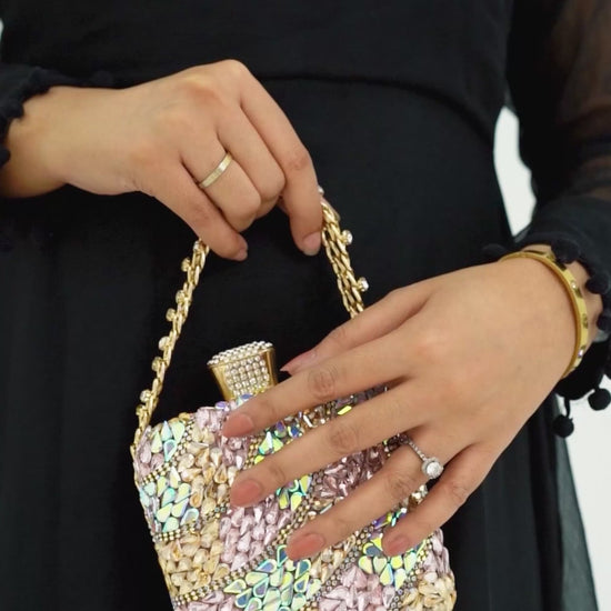 This crystal-embellished clutch captures the essence of modern luxury sleek, structured and effortlessly radiant. Its shimmering surface dances with light, while the crystal-studded clasp and metallic chain strap add a hint of elevated sophistication. Designed to complement both couture and contemporary ensembles, Elára Luxe transitions seamlessly from evening soirées to wedding receptions and red-carpet moments. Elára Luxe is your timeless statement of refined glamour.